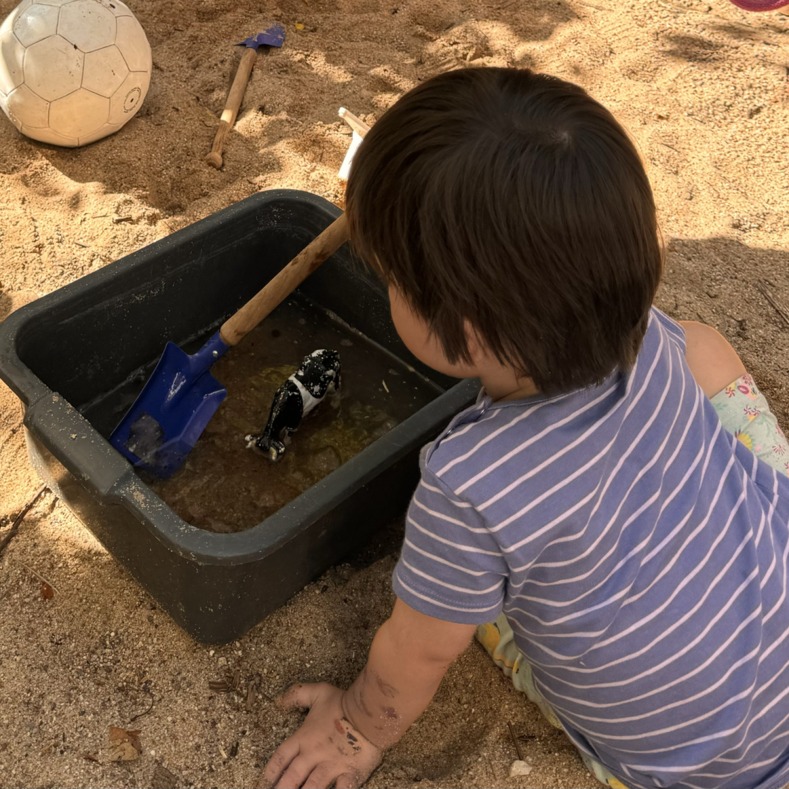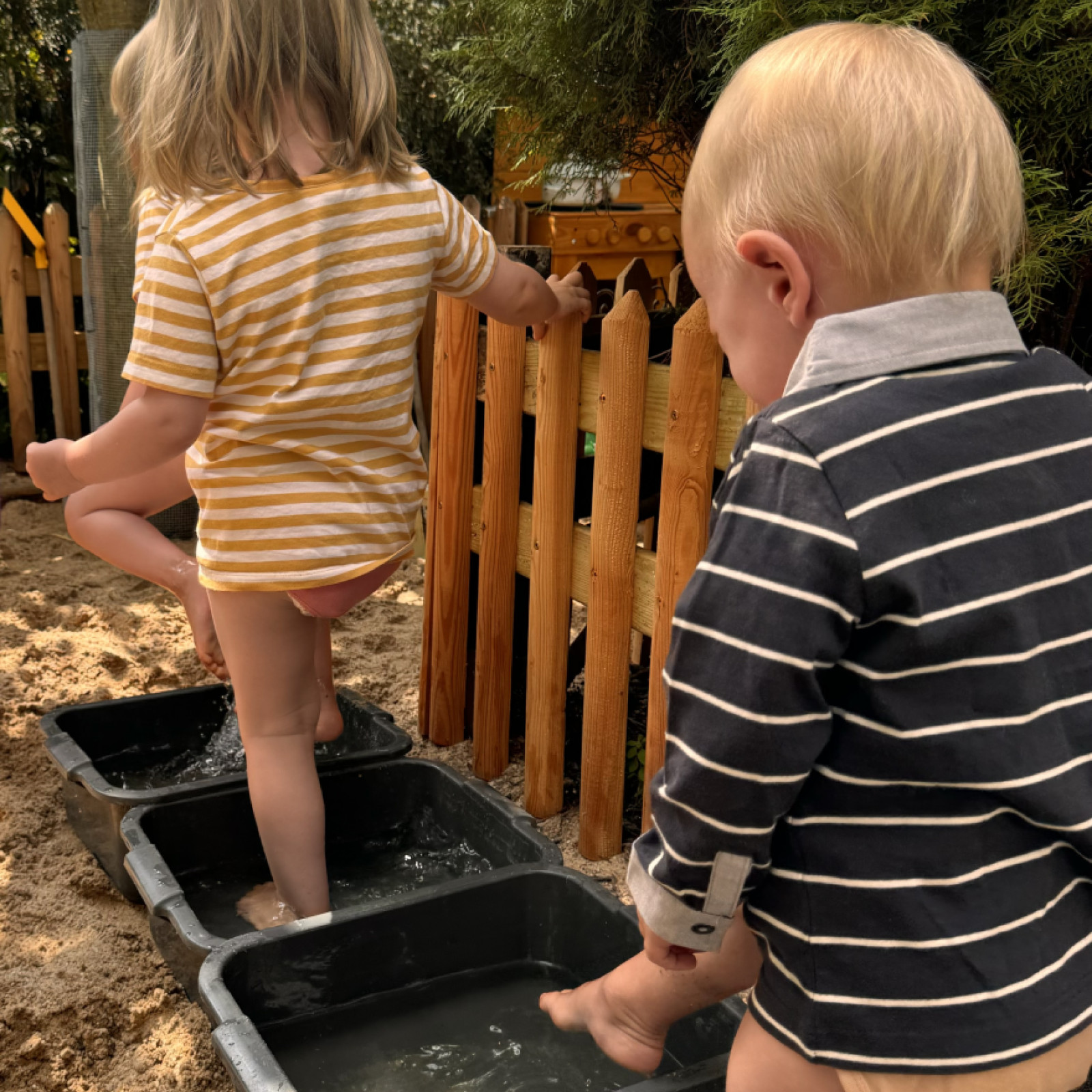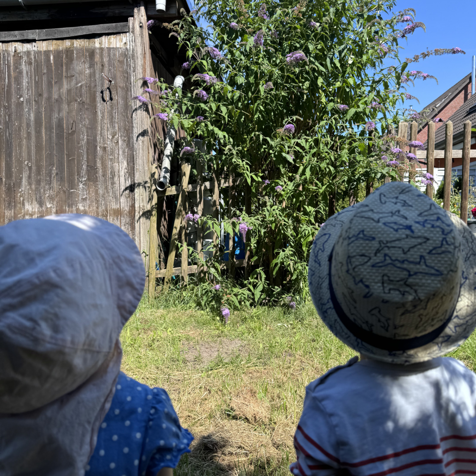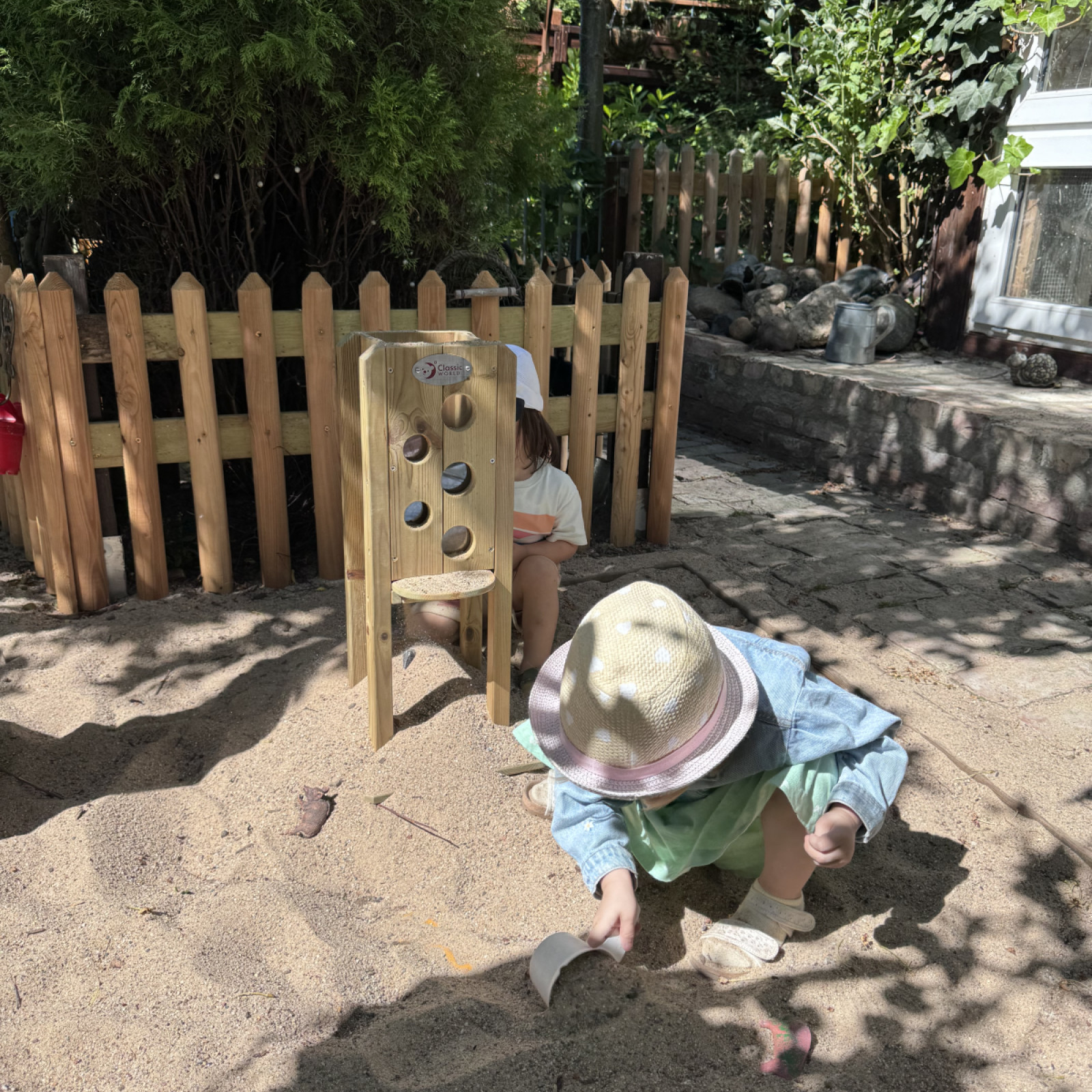 ... ein kleiner Garten mit Sandbereich, Matschmöglichkeit und Schattenplätzen.